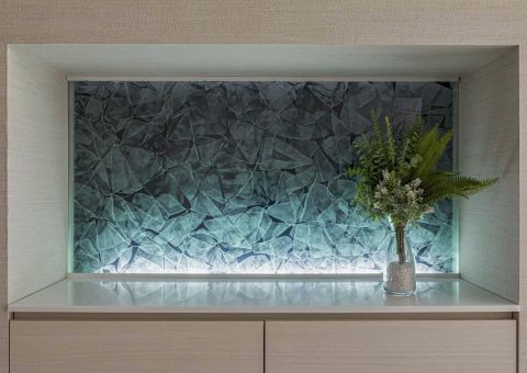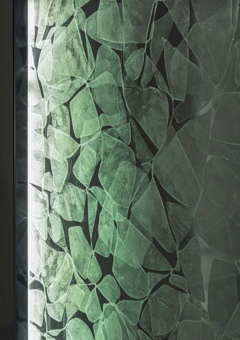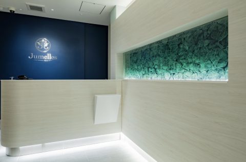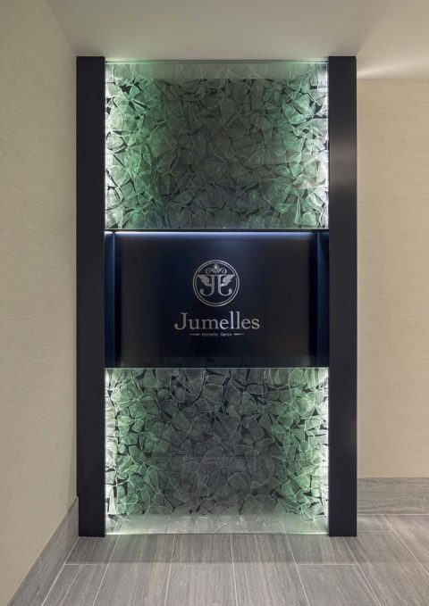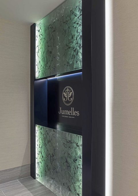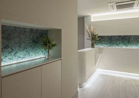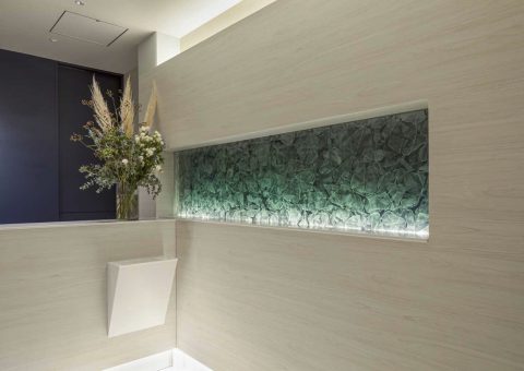都心にありながら、喧騒から離れた代官山の一角に佇む、プライベートエステサロン。立体的な花びら模様を結晶化させた「雪花硝子」を用いた内装は、表情豊かに空間を演出する。これまでのエステから一歩先へ。空間に癒されて、技術で美しくなり、心が満たされる空間を目指している。