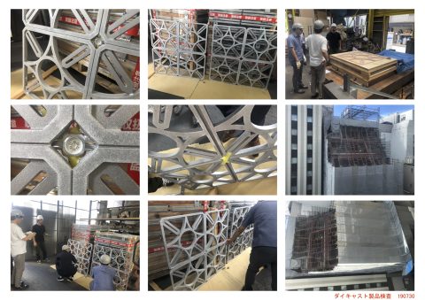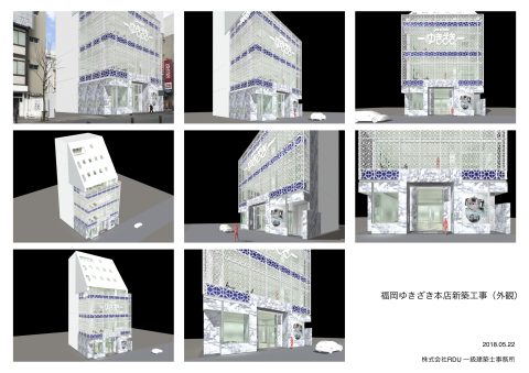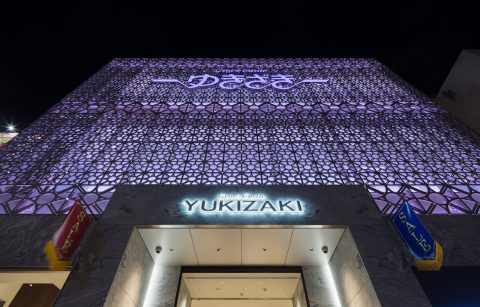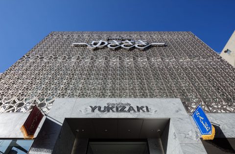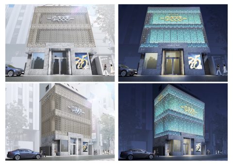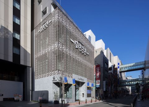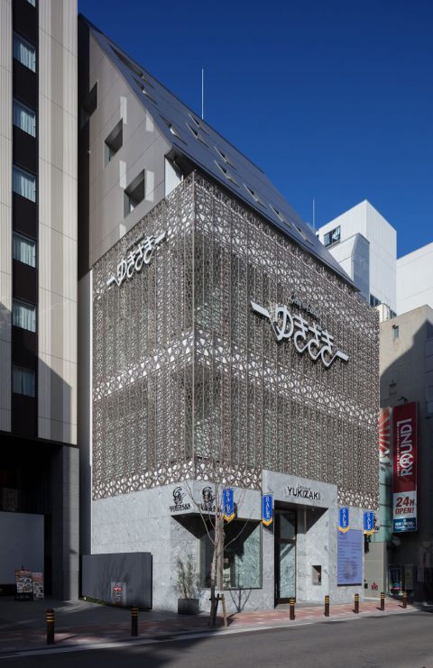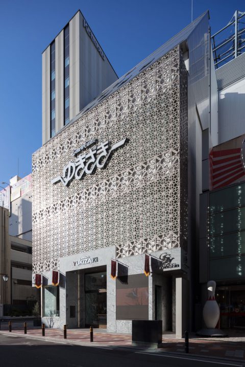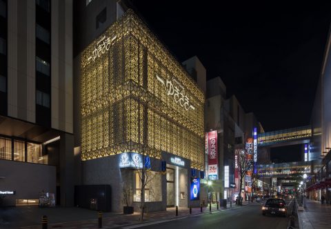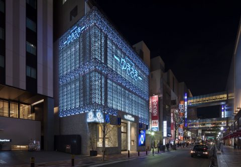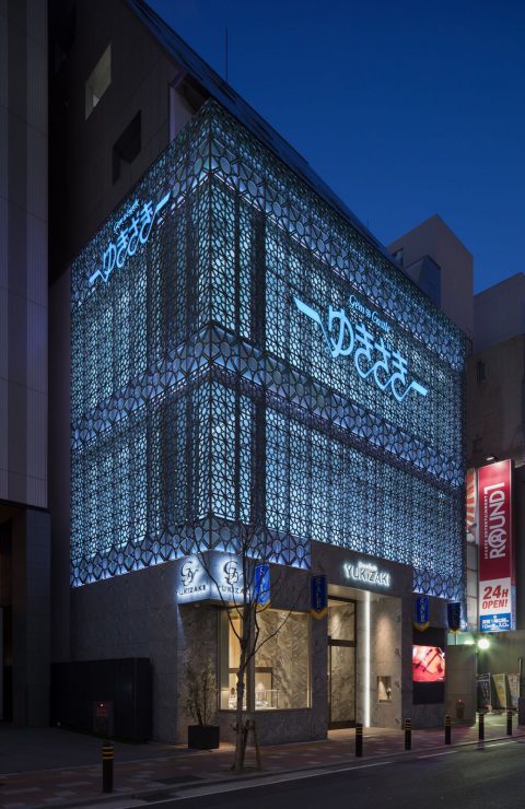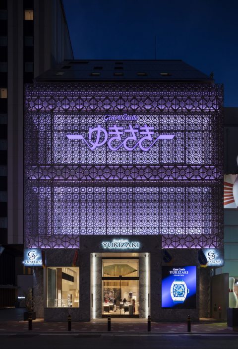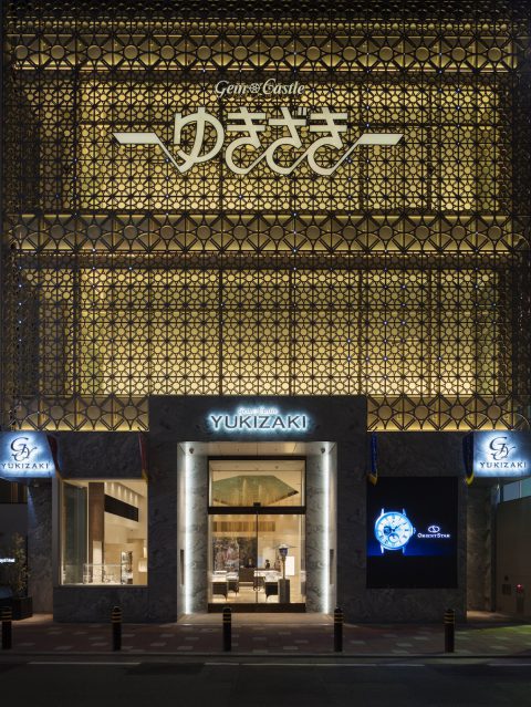 時計・ジュエリーの販売・修理を行う「ジェムキャッスルゆきざき」の福岡本店ビル。家紋をあしらったダイキャストのスクリーンによる外壁と、その中に埋め込まれたLEDによって、昼夜に異なった表情を見せる。[撮影:針金建築写真事務所]
