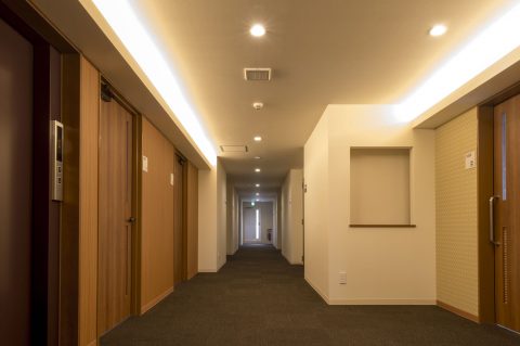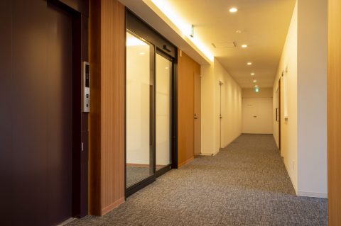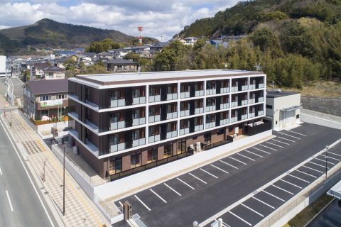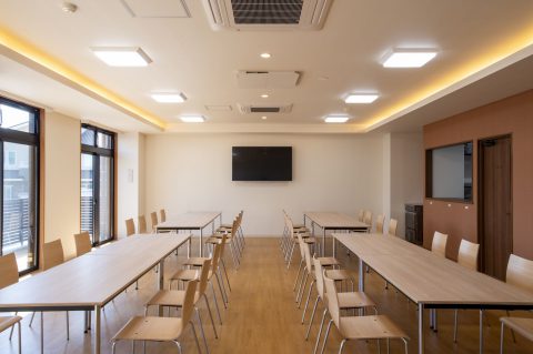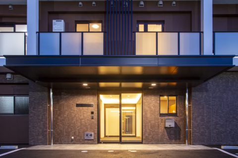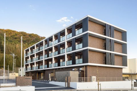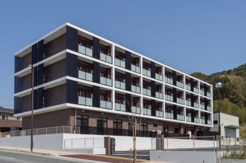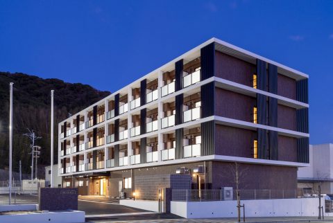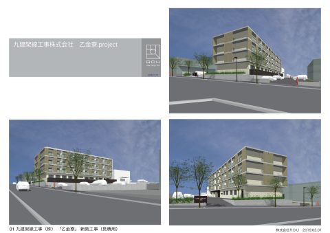 九建架線 乙金寮:2019 住宅施設 場所 大野城市乙金 規模 RC造 4階建 面積 1937.46m² (586.08坪) 施工 株式会社 松本組 送電設備の工事および保全の仕事を行う(株)九建グループの一つ、九建架線工事の社員寮。1Fに食堂や共同浴室を設け、上階に共同の洗面・便所を持つ60室の全個室である。 これまでも「横手」「松橋」「筑紫野」の社員寮の個室化を図る建替を進めてきた。